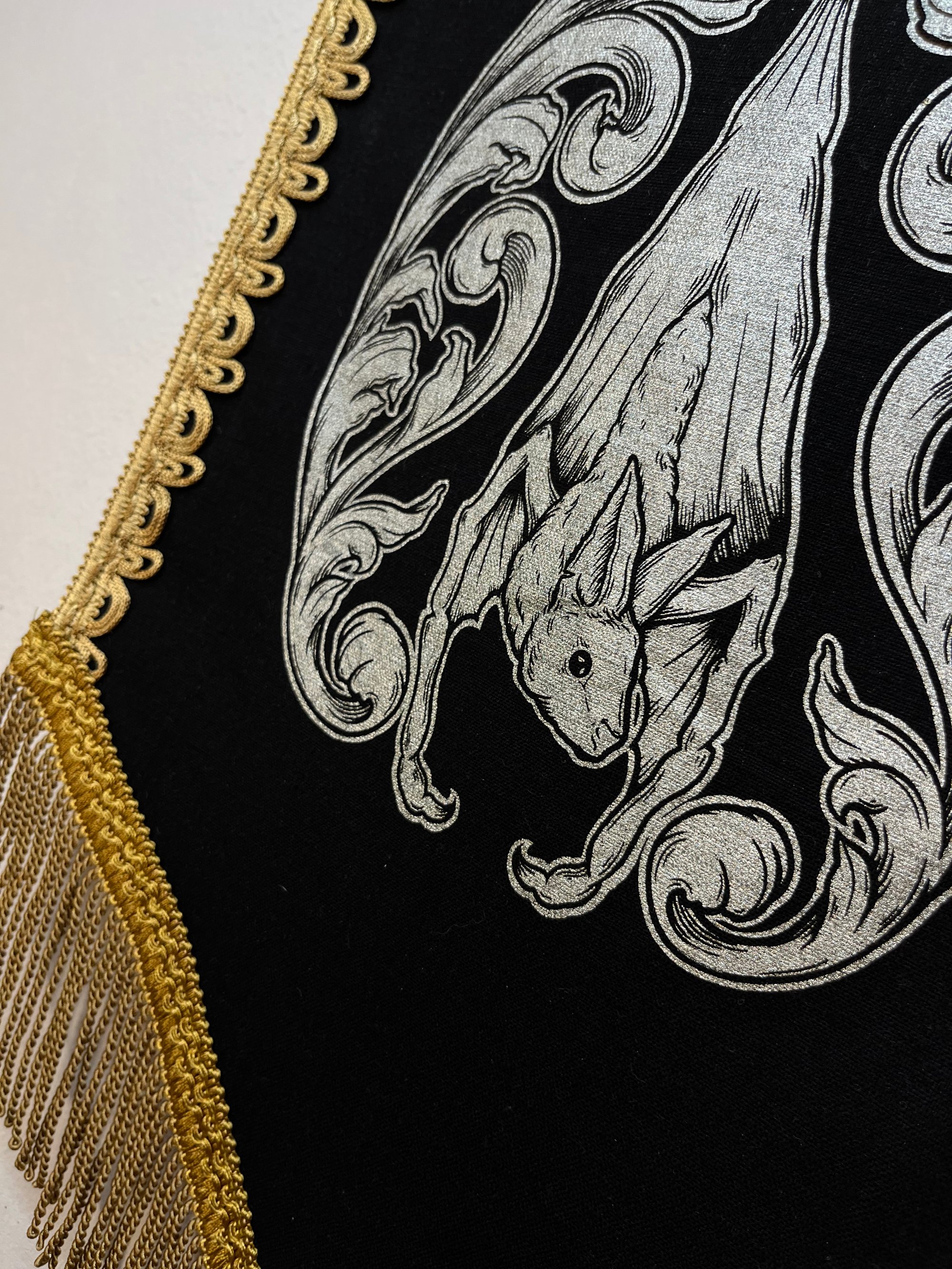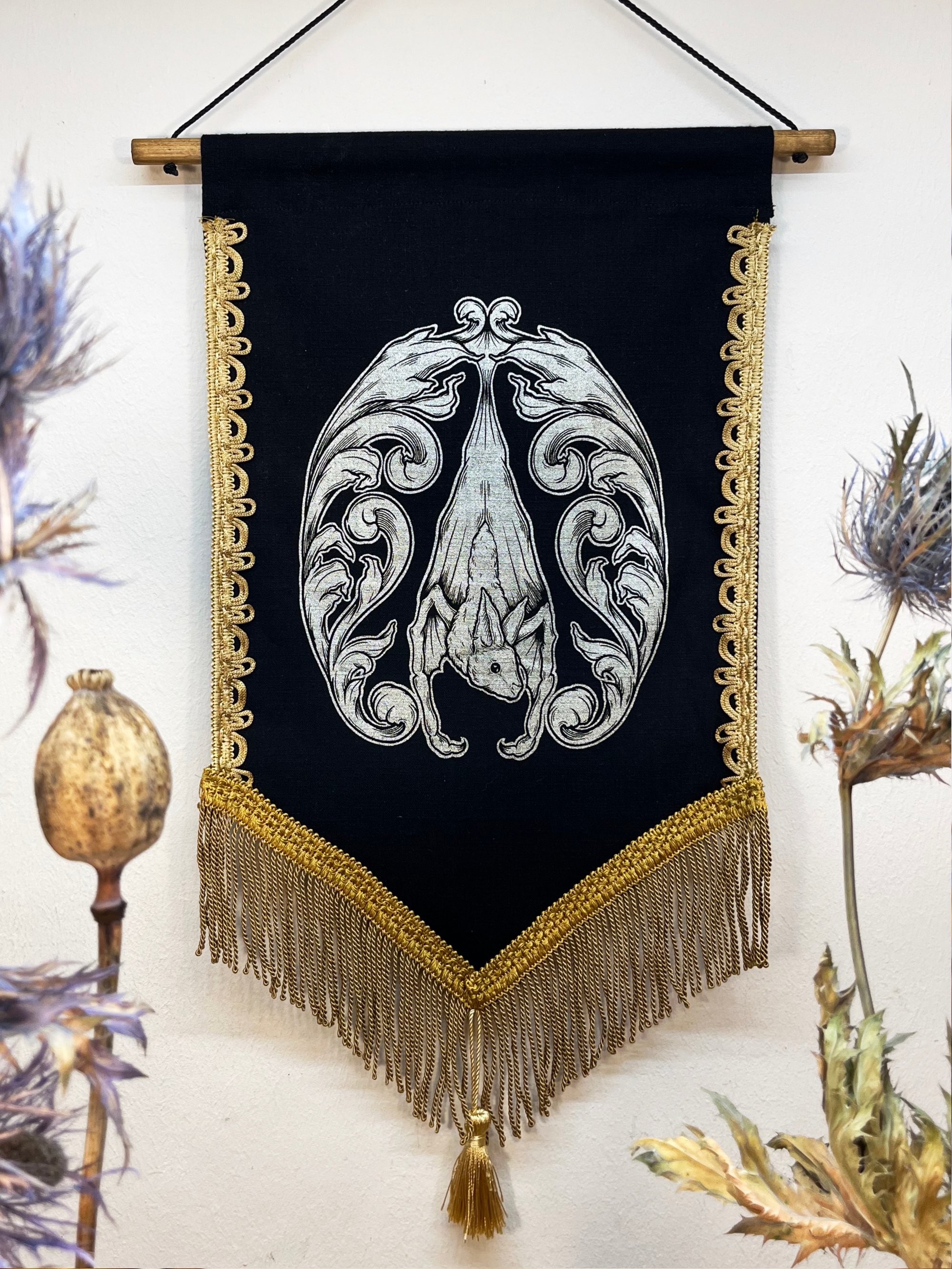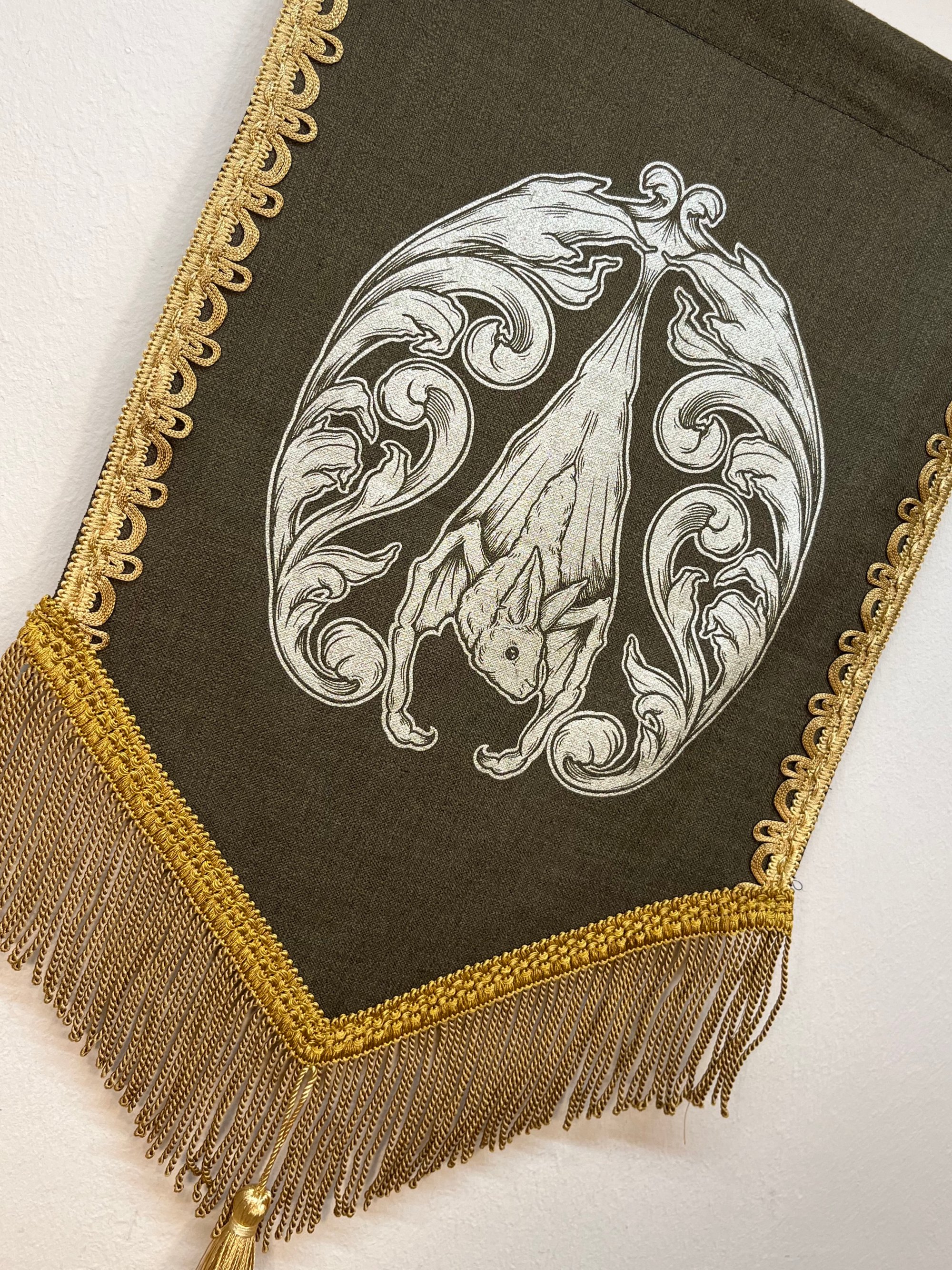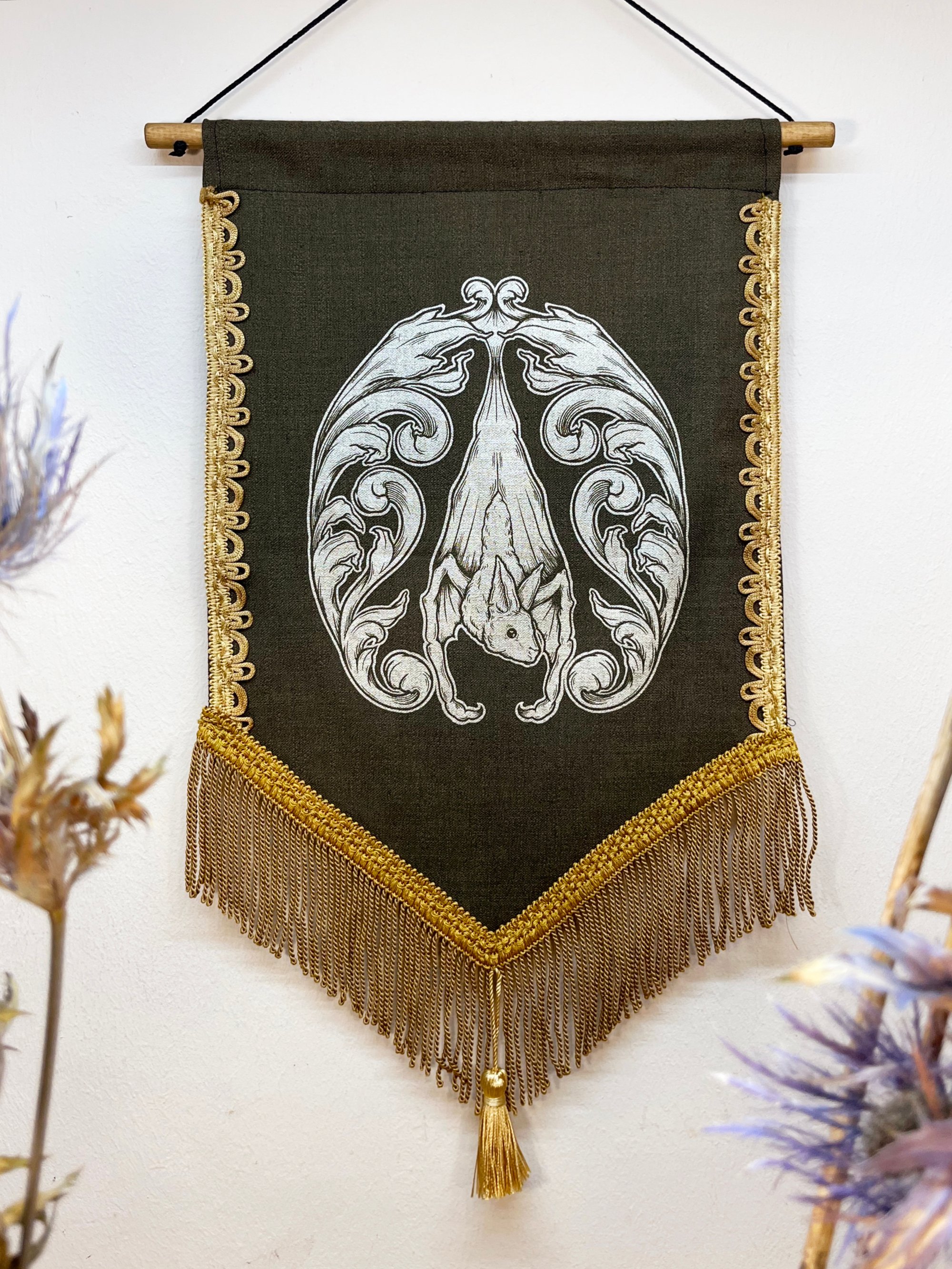The 'Bat' banner is made from linen fabric and features two different golden trims, as well as other high-quality materials. Each banner is screen-printed, sewn using a sewing machine and finished by hand. Banners are available with gold print and trim on black fabric or on a deep green fabric (which is more neutral/ochre undertone). If you're interested in a banner with a different motif, you can also find a version featuring a bat in my shop. The last picture shows a comparison of all the designs.